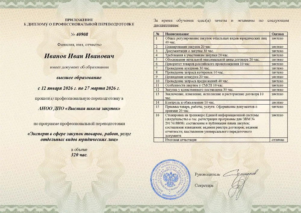 Слушатели получают диплом о профессиональной переподготовке установленного образца с присвоением квалификации «Эксперт в сфере закупок». Высшая школа закупок работает по лицензии, поэтому данные об обучении в Донецке обязательно вносятся в реестр ФИС ФРДО. Это легитимный документ для карьерного роста в любой организации Донецка.