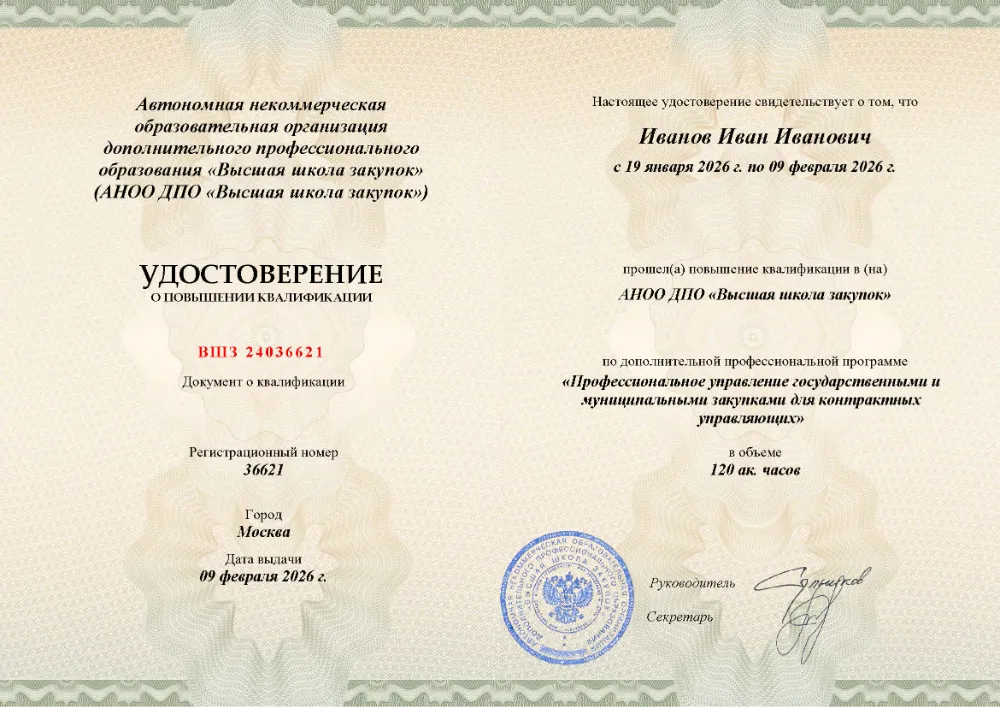 Вы получаете официальное удостоверение о повышении квалификации. Высшая школа закупок (fz44.org) обеспечивает передачу данных в реестр ФИС ФРДО, подтверждая соответствие вашей подготовки в Донецке требованиям Минтруда.